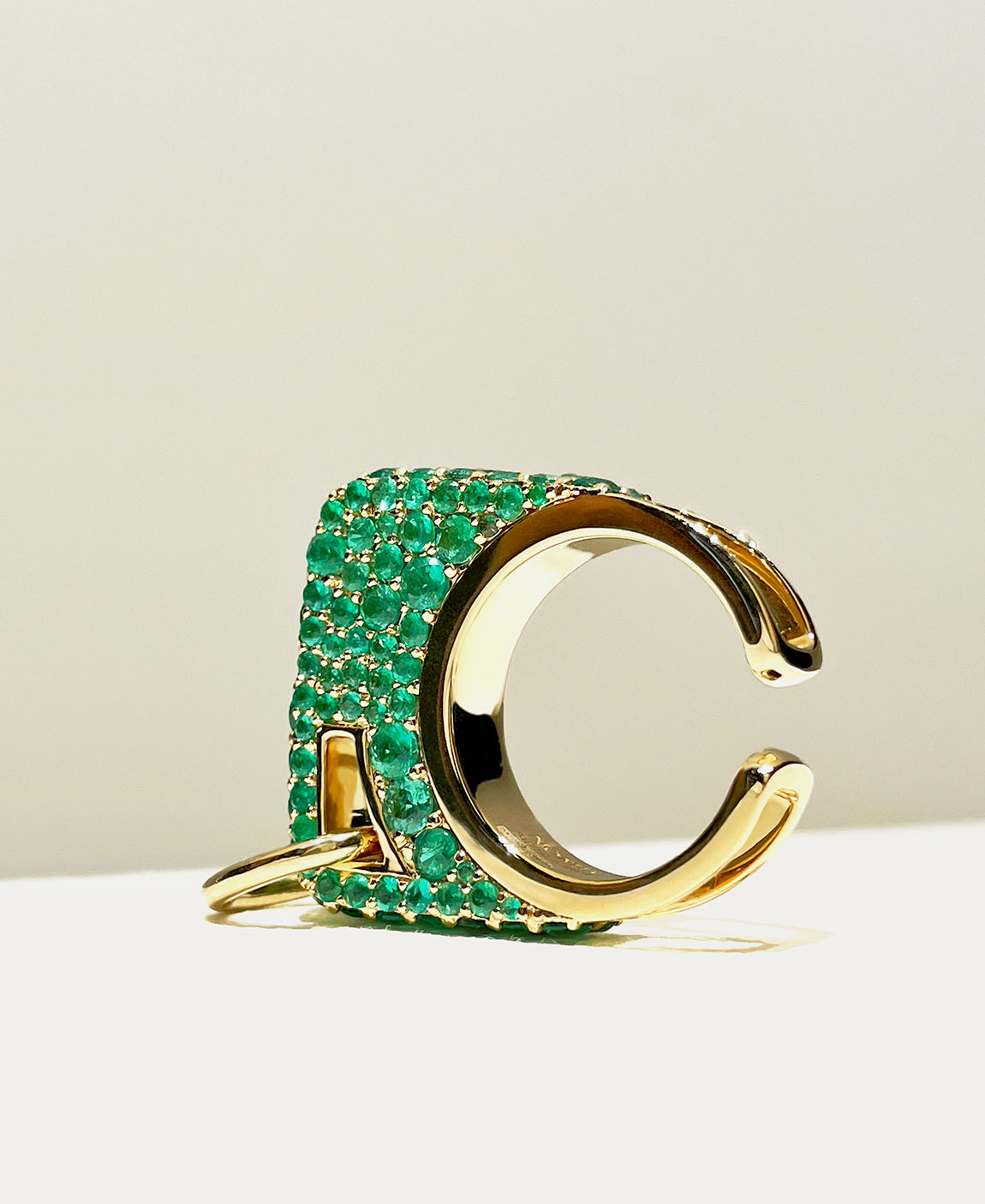 The Theda ear cuff/ring is handcrafted from 18-karat gold. Inspired by the aesthetics of silent films and the legendary actress Theda Bara, this piece is encrusted with natural emeralds. Its versatile design allows it to be styled as an ear cuff, a ring, or a pendant.