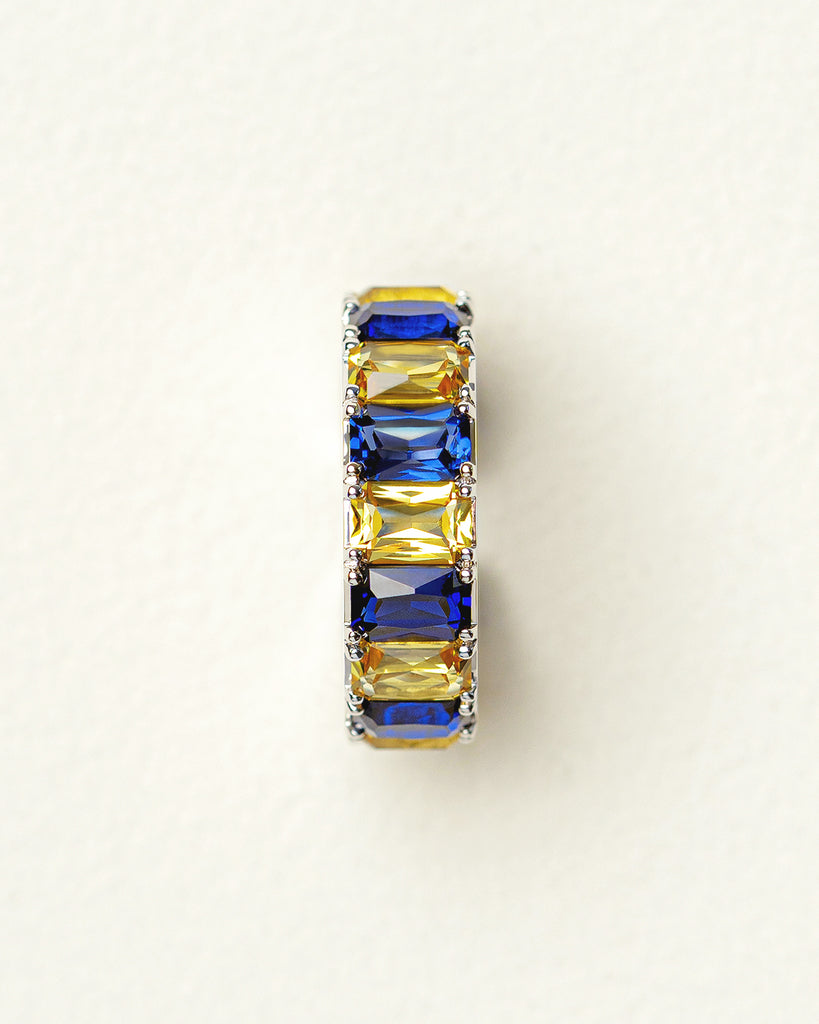 The Kyiv ear cuff/ring in size L is crafted from 18-karat gold. Featuring an iconic design and a striking combination of lab grown yellow and blue sapphires, the piece pays homage to a Ukrainian city deeply significant to the designer. Its multifunctional design allows it to be worn as an ear cuff or a ring.