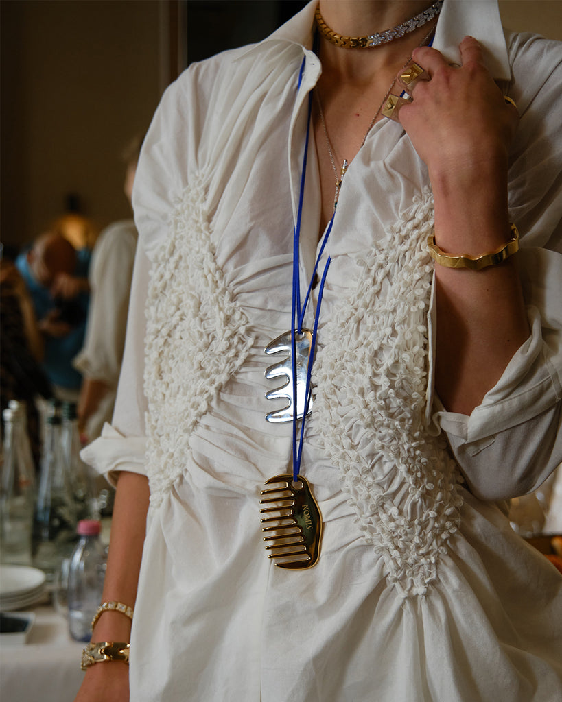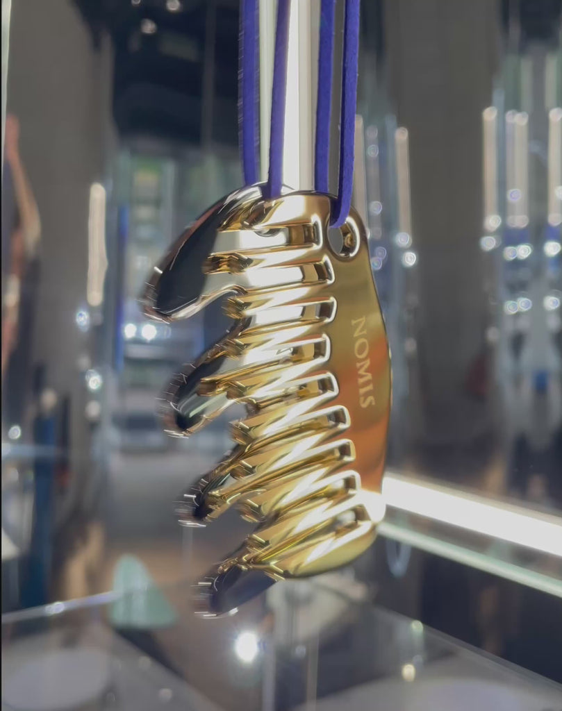 Introducing the NOMIS Gua Sha pendants, a pair consisting of one gold and one white, made from premium medical-grade steel, paired with soft Alcantara cords. True to the NOMIS brand, these Gua Shas are multi-functional. Wear them as a striking necklace, use as a hair comb or an accessory for gua-sha massage, or attach them as a charm to your beloved handbag.