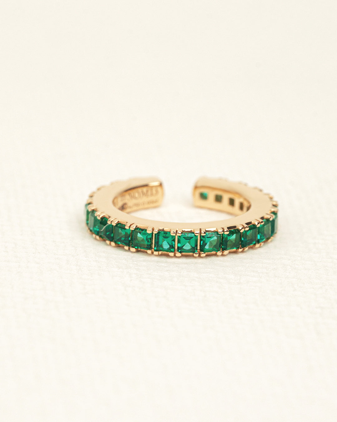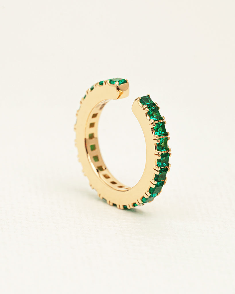 Каф/ каблучка Yayoi K виконаний майстрами вручну з 18-каратного золота та доповнений смарагдами. Дизайн виробу, що гармонійно поєднує геометричні форми та яскраві акценти, натхнений творчістю японської художниці Яйої Кусами. Модель легко стилізувати як каф або фалангову каблучку.